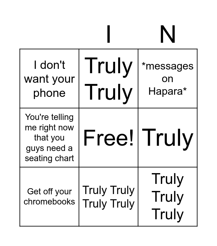This bingo card has a free space and 8 words: Truly, *messages on Hapara*, Truly Truly, Get off your chromebooks, I don't want your phone, Truly Truly Truly, You're telling me right now that you guys need a seating chart and Truly Truly Truly Truly.