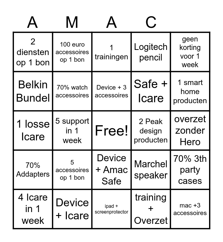 This bingo card has a free space and 24 words: 5 accessoires op 1 bon, Device + Icare, Device + 3 accessoires, 4 Icare in 1 week, geen korting voor 1 week, 2 diensten op 1 bon, Belkin Bundel, 100 euro accessoires op 1 bon, 2 Peak design producten, Device + Amac Safe, Safe + Icare, 1 losse Icare, Marchel speaker, 70% 3th party cases, 70% watch accessoires, training + Overzet, overzet zonder Hero, 1 trainingen, 1 smart home producten, 5 support in 1 week, mac +3 accessoires, 70% Addapters, Logitech pencil and ipad + screenprotector.