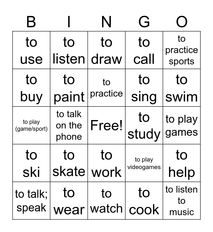 This bingo card has a free space and 28 words: to help, to dance, to sing, to cook, to buy, to draw, to listen, to ski, to study, to talk; speak, to play (game/sport), to call, to wear, to watch, to swim, to need, to skate, to paint, to practice, to work, to use, to help around the house, to listen to music, to talk on the phone, to play games, to play videogames, to practice sports and to play (an instrument).
