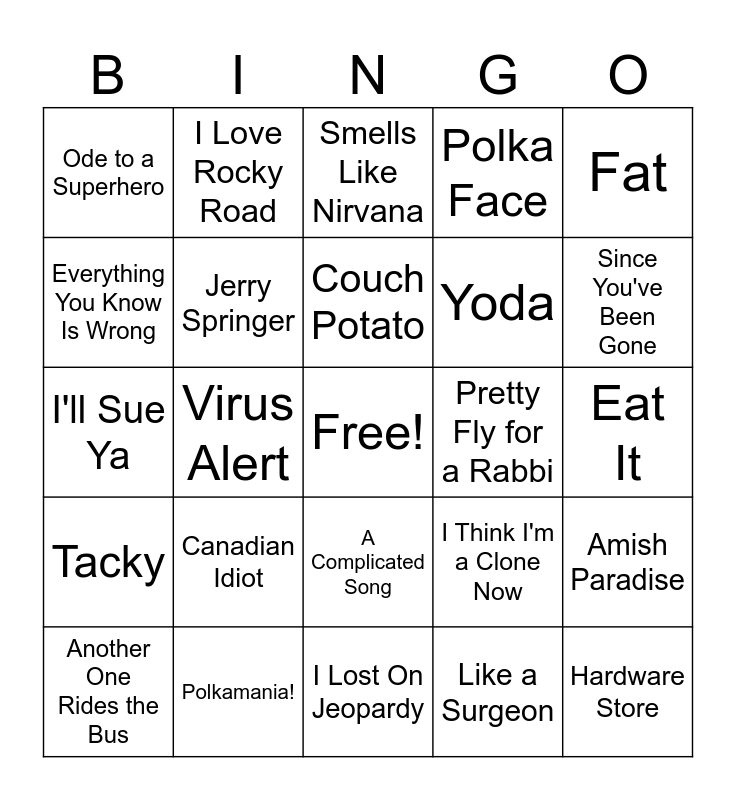 This bingo card has a free space and 37 words: White & Nerdy, Party In the CIA, Ebay, Jerry Springer, Amish Paradise, Canadian Idiot, Couch Potato, Perform This Way, Fat, TMZ, Virus Alert, Polka Face, Hardware Store, Eat It, Everything You Know Is Wrong, Tacky, Dare to Be Stupid, Smells Like Nirvana, A Complicated Song, Pretty Fly for a Rabbi, Ode to a Superhero, Since You've Been Gone, Another One Rides the Bus, I Lost On Jeopardy, My Bologna, Like a Surgeon, I Love Rocky Road, Handy, Angry White Boy Polka, Foil, Word Crimes, Polkamania!, I'll Sue Ya, Gump, I Think I'm a Clone Now, Yoda and One More Minute.