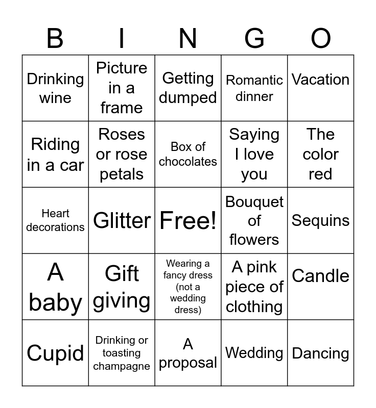 This bingo card has a free space and 25 words: A baby, Drinking or toasting champagne, A proposal, Wedding, Vacation, Drinking wine, Picture in a frame, Getting dumped, Bouquet of flowers, Candle, Riding in a car, Roses or rose petals, Banner or sign with words on it, A pink piece of clothing, The color red, Cupid, Glitter, Box of chocolates, Saying I love you, Sequins, Heart decorations, Gift giving, Wearing a fancy dress (not a wedding dress), Romantic dinner and Dancing.