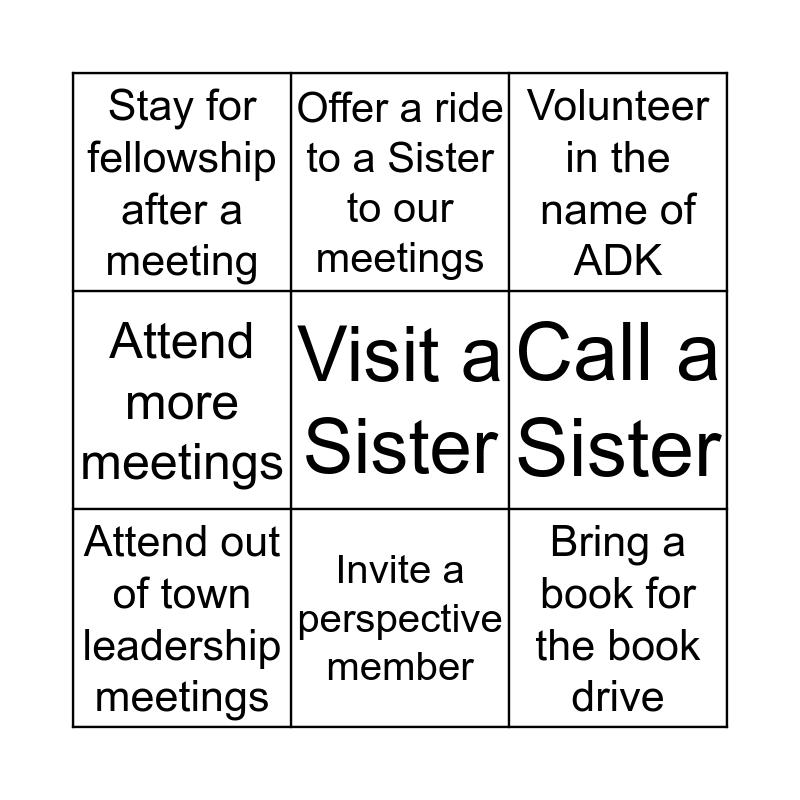 This bingo card has a free space and 8 words: Call a Sister, Volunteer in the name of ADK, Offer a ride to a Sister to our meetings, Attend out of town leadership meetings, Stay for fellowship after a meeting, Bring a book for the book drive, Attend more meetings and Invite a perspective member.