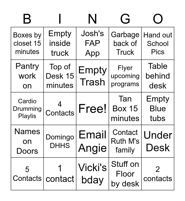 This bingo card has a free space and 29 words: 5 Contacts, Table 15 minutes, 4 Contacts, Email Medilodge Payments, Boxes by closet 15 minutes, Josh's FAP App, Top of Desk 15 minutes, Domingo DHHS, Tan Box 15 minutes, 1 contact, Empty Blue tubs, 2 contacts, Vicki's bday, Stuff on Floor by desk, Table behind desk, Respond to Lindsey, Email Angie, Names on Doors, Hand out School Pics, Cardio Drumming Playlis, Contact Ruth M's family, Order T-shirts, Flyer upcoming programs, Pantry work on, Garbage back of Truck, Empty inside truck, Under Desk, Empty Trash and Stuff on Floor by black cabinet.