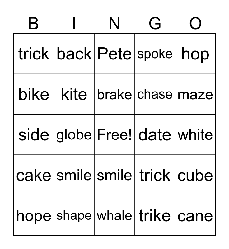 This bingo card has a free space and 24 words: smile, shape, brake, hope, hop, trick, bike, back, date, smile, chase, side, trick, cube, kite, trike, white, Pete, maze, globe, cane, cake, spoke and whale.
