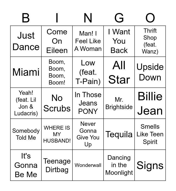 This bingo card has a free space and 75 words: Free!, I Had Some Help, Man! I Feel Like A Woman, Despacito, Dilemma, Forgot About Dre - Album Version (Edited), Gasolina, Get Low - Radio Edit, Hey Ya!, Hypnotize - 2007 Remaster, I Know You Want Me (Calle Ocho), Ice Ice Baby, Low (feat. T-Pain), Miami, Ms. Jackson, No Scrubs, Rapper's Delight - Single Version, Signs, Temperature, Thrift Shop (feat. Wanz), Umbrella, Yeah! (feat. Lil Jon & Ludacris), Boom, Boom, Boom, Boom!, Come On Eileen, I Want You Back, Le Freak, Mamma Mia, Mundian to Bach Ke, Rhythm Is a Dancer, Sandstorm, September, Stayin' Alive, Sway, Tequila, Upside Down, All Star, All The Things She Said, Bad Romance, Billie Jean, Dancing in the Moonlight, Espresso, Everybody (Backstreet's Back) - Radio Edit, Glamorous, Good Luck, Babe!, Hips Don't Lie (feat. Wyclef Jean), Hollaback Girl, It's Gonna Be Me, Just Dance, Livin' la Vida Loca, Mambo No. 5 (a Little Bit of...), Mystical Magical, Never Gonna Give You Up, Promiscuous, Shape of You, Sk8er Boi, Sorry, Teenage Dream, Uptown Funk, Wannabe, Watermelon Sugar, WHERE IS MY HUSBAND!, Bohemian Rhapsody - Remastered 2011, Enter Sandman, Eye of the Tiger - 2006 Master, Last Resort, Mr. Brightside, Fight For Your Right, Roxanne, Seven Nation Army, Smells Like Teen Spirit, Somebody Told Me, Teenage Dirtbag, Welcome To The Jungle, Wonderwall and You Make My Dreams (Come True).