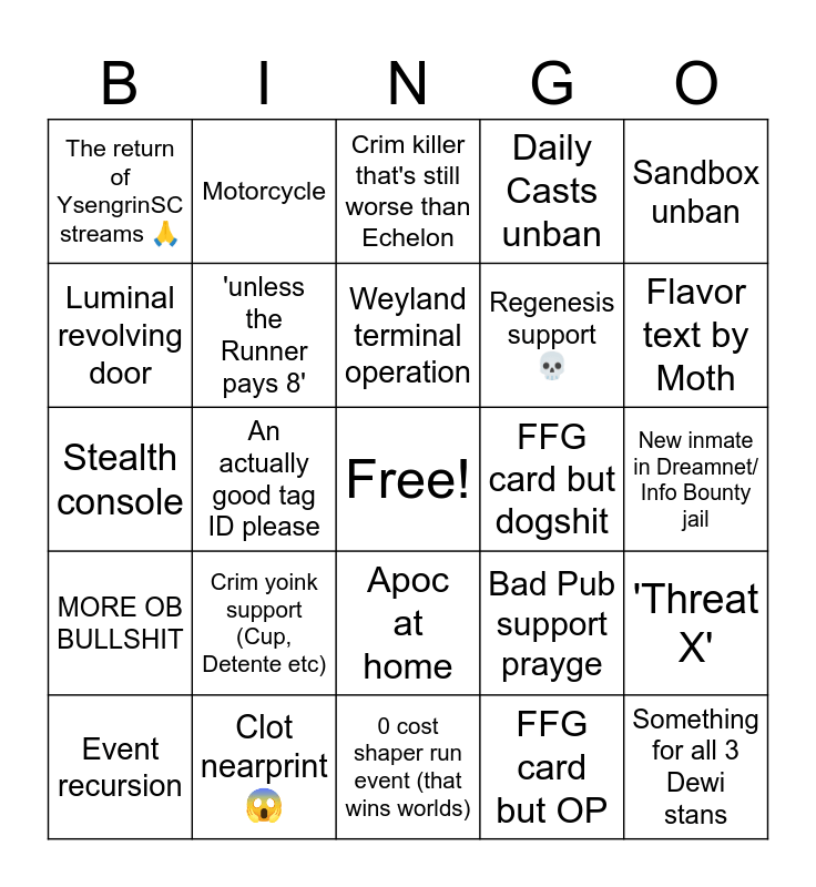 This bingo card has a free space and 24 words: Event recursion, Crim yoink support (Cup, Detente etc), Weyland terminal operation, FFG card but OP, Sandbox unban, The return of YsengrinSC streams 🙏, Motorcycle, Crim killer that's still worse than Echelon, FFG card but dogshit, New inmate in Dreamnet/ Info Bounty jail, Stealth console, 'unless the Runner pays 8', Bad Pub support prayge, 'Threat X', Luminal revolving door, Clot nearprint 😱, 0 cost shaper run event (that wins worlds), Daily Casts unban, Flavor text by Moth, MORE OB BULLSHIT, An actually good tag ID please, Apoc at home, Regenesis support 💀 and Something for all 3 Dewi stans.