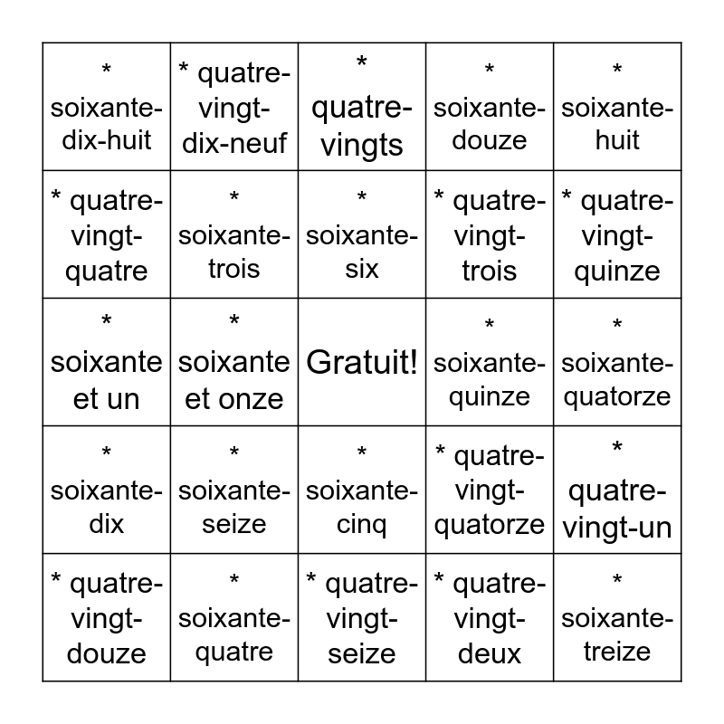 This bingo card has a free space and 40 words: * soixante, * soixante et un, * soixante-deux, * soixante-trois, * soixante-quatre, * soixante-cinq, * soixante-six, * soixante-sept, * soixante-huit, * soixante-dix, * soixante et onze, * soixante-douze, * soixante-treize, * soixante-quatorze, * soixante-quinze, * soixante-seize, * soixante-dix-sept, * soixante-dix-huit, * soixante-dix-neuf, * quatre-vingts, * quatre-vingt-un, * quatre-vingt-deux, * quatre-vingt-trois, * quatre-vingt-quatre, * quatre-vingt-cinq, * quatre-vingt-six, * quatre-vingt-sept, * quatre-vingt-huit, * quatre-vingt-neuf, * quatre-vingt-dix, * quatre-vingt-onze, * quatre-vingt-douze, * quatre-vingt-treize, * quatre-vingt-quatorze, * quatre-vingt-quinze, * quatre-vingt-seize, * quatre-vingt-dix-sept, * quatre-vingt-dix-huit, * quatre-vingt-dix-neuf and * cent.