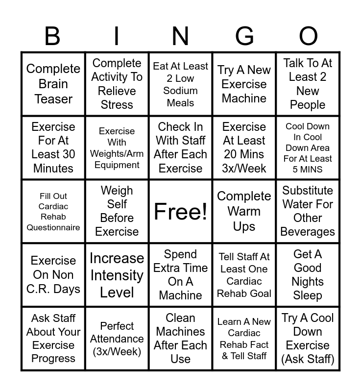 This bingo card has a free space and 24 words: Increase Intensity Level, Perfect Attendance (3x/Week), Check In With Staff After Each Exercise, Ask Staff About Your Exercise Progress, Talk To At Least 2 New People, Complete Brain Teaser, Exercise For At Least 30 Minutes, Complete Activity To Relieve Stress, Complete Warm Ups, Spend Extra Time On A Machine, Exercise At Least 20 Mins 3x/Week, Fill Out Cardiac Rehab Questionnaire, Tell Staff At Least One Cardiac Rehab Goal, Get A Good Nights Sleep, Exercise With Weights/Arm Equipment, Learn A New Cardiac Rehab Fact & Tell Staff, Substitute Water For Other Beverages, Eat At Least 2 Low Sodium Meals, Cool Down In Cool Down Area For At Least 5 MINS, Weigh Self Before Exercise, Try A Cool Down Exercise (Ask Staff), Exercise On Non C.R. Days, Try A New Exercise Machine and Clean Machines After Each Use.