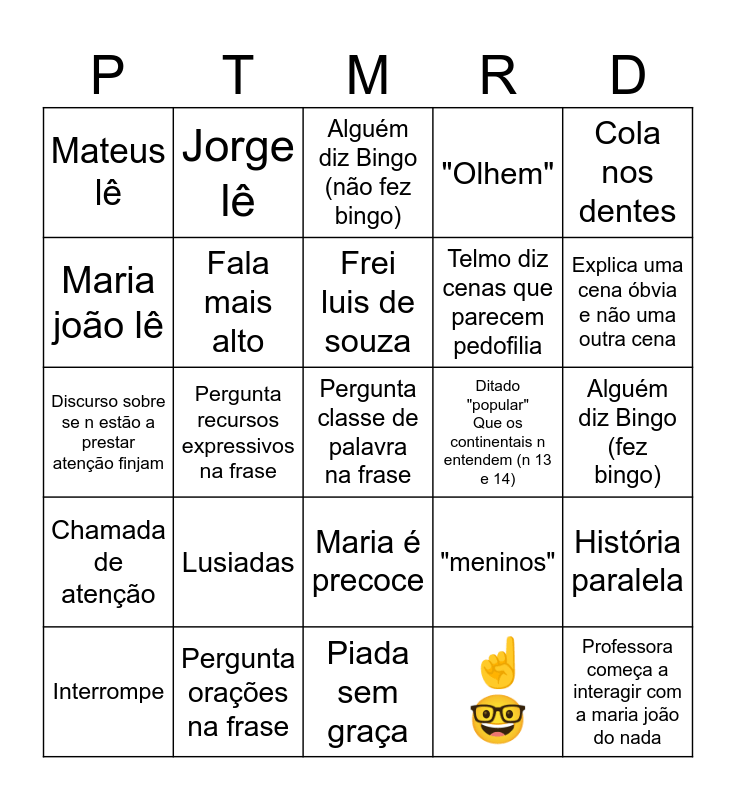 This bingo card has 25 words: Lusiadas, Piada sem graça, Frei luis de souza, Interrompe, Cola nos dentes, Mateus lê, Maria joão lê, Jorge lê, Ditado "popular" Que os continentais n entendem (n 13 e 14), Maria é precoce, Telmo diz cenas que parecem pedofilia, Discurso sobre se n estão a prestar atenção finjam, "meninos", História paralela, Fala mais alto, Professora começa a interagir com a maria joão do nada, Alguém diz Bingo (fez bingo), Alguém diz Bingo (não fez bingo), Explica uma cena óbvia e não uma outra cena, Pergunta recursos expressivos na frase, Pergunta classe de palavra na frase, Pergunta orações na frase, Chamada de atenção, "Olhem" and ☝️🤓.