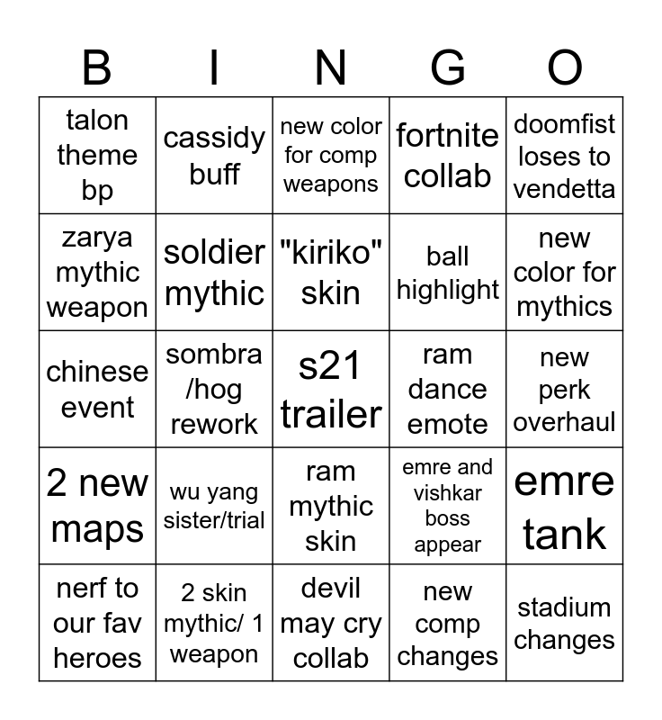 This bingo card has a free space and 24 words: wu yang sister/trial, 2 skin mythic/ 1 weapon, "kiriko" skin, nerf to our fav heroes, doomfist loses to vendetta, talon theme bp, zarya mythic weapon, cassidy buff, ram dance emote, ram mythic skin, ball highlight, chinese event, emre and vishkar boss appear, emre tank, soldier mythic, new comp changes, new perk overhaul, new color for comp weapons, new color for mythics, sombra /hog rework, stadium changes, 2 new maps, fortnite collab and devil may cry collab.