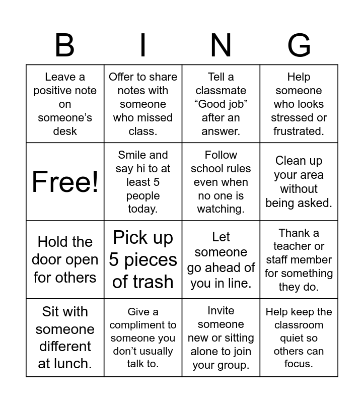 This bingo card has 16 words: Give a compliment to someone you don’t usually talk to., Thank a teacher or staff member for something they do., Tell a classmate “Good job” after an answer., Leave a positive note on someone’s desk, Hold the door open for others, Offer to share notes with someone who missed class., Let someone go ahead of you in line., Invite someone new or sitting alone to join your group., Free!, Smile and say hi to at least 5 people today., Sit with someone different at lunch., Help someone who looks stressed or frustrated., Pick up 5 pieces of trash, Clean up your area without being asked., Follow school rules even when no one is watching. and Help keep the classroom quiet so others can focus..