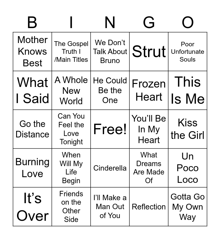 This bingo card has a free space and 30 words: Friends on the Other Side, Fabulous, Can You Feel the Love Tonight, Shiny, Mother Knows Best, We Don’t Talk About Bruno, A Whole New World, Cinderella, You’ll Be In My Heart, I’ll Make a Man Out of You, Kiss the Girl, Gotta Go My Own Way, Reflection, Stand Out, This Is Me, Honor To Us All, What Dreams Are Made Of, Burning Love, When Will My Life Begin, Poor Unfortunate Souls, Go the Distance, Just Around the Riverbend, The Gospel Truth I /Main Titles, Frozen Heart, What I Said, Strut, Un Poco Loco, It’s Over, He Could Be the One and A Dream Is a Wish Your Heart Makes.