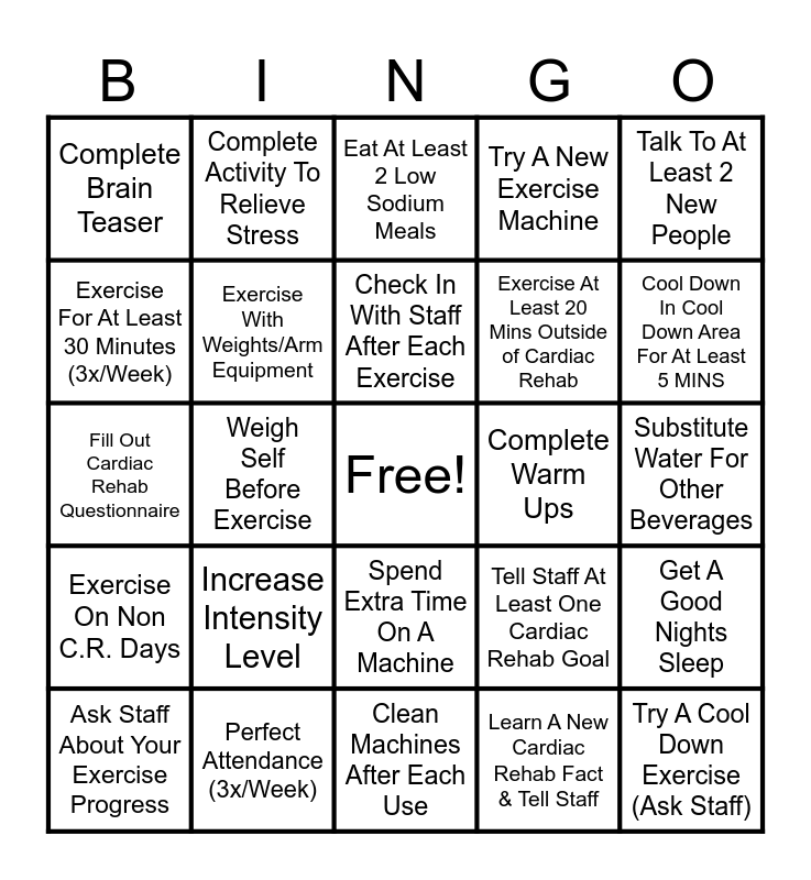 This bingo card has a free space and 24 words: Increase Intensity Level, Perfect Attendance (3x/Week), Check In With Staff After Each Exercise, Ask Staff About Your Exercise Progress, Talk To At Least 2 New People, Complete Brain Teaser, Exercise For At Least 30 Minutes (3x/Week), Complete Activity To Relieve Stress, Complete Warm Ups, Spend Extra Time On A Machine, Exercise At Least 20 Mins Outside of Cardiac Rehab, Fill Out Cardiac Rehab Questionnaire, Tell Staff At Least One Cardiac Rehab Goal, Get A Good Nights Sleep, Exercise With Weights/Arm Equipment, Learn A New Cardiac Rehab Fact & Tell Staff, Substitute Water For Other Beverages, Eat At Least 2 Low Sodium Meals, Cool Down In Cool Down Area For At Least 5 MINS, Weigh Self Before Exercise, Try A Cool Down Exercise (Ask Staff), Exercise On Non C.R. Days, Try A New Exercise Machine and Clean Machines After Each Use.