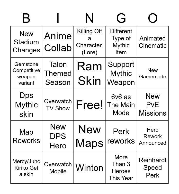 This bingo card has a free space and 24 words: New DPS Hero, Overwatch Mobile, Ram Skin, Mercy/Juno Kiriko Get a skin, Animated Cinematic, New Stadium Changes, Gemstone Competitive weapon variant, Anime Collab, 6v6 as The Main Mode, New Maps, Support Mythic Weapon, Dps Mythic skin, Perk reworks, Hero Rework Announced, Talon Themed Season, More Than 3 Heroes This Year, New PvE Missions, Killing Off a Character. (Lore), New Gamemode, Overwatch TV Show, Reinhardt Speed Perk, Map Reworks, Different Type of Mythic Item and Winton.