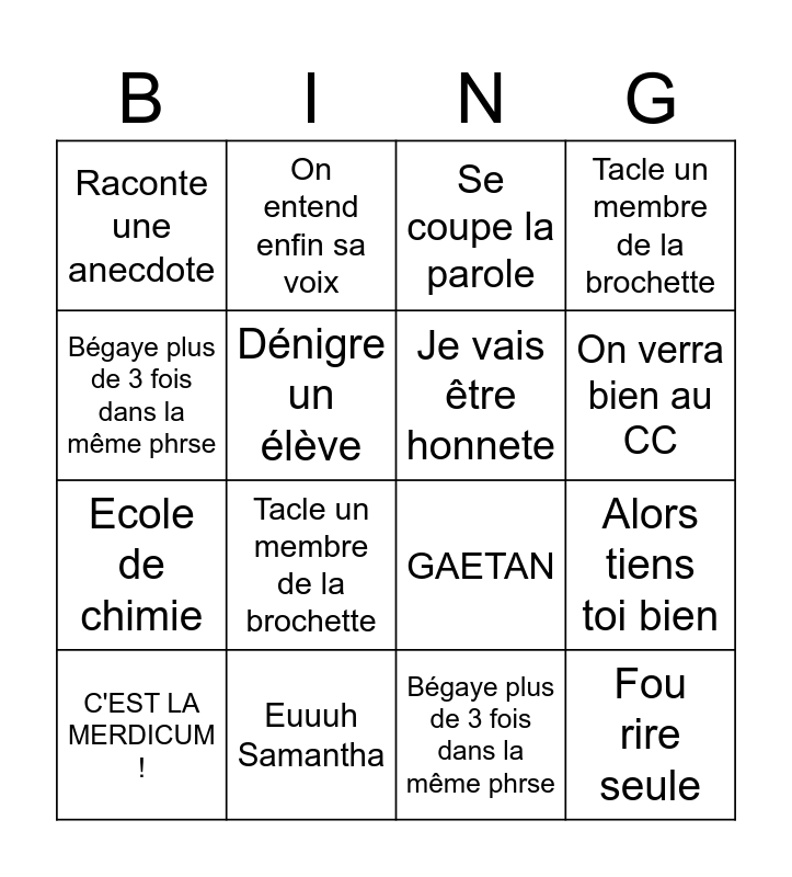 This bingo card has 20 words: Alors tiens toi bien, Soraya, Se coupe la parole, S'enerve parce qu'il y'a trop de bruit, C'EST LA MERDICUM !, Bégaye plus de 3 fois dans la même phrse, Euuuh Samantha, Raconte une anecdote, Ecole de chimie, On entend enfin sa voix, Tacle un membre de la brochette, GAETAN, Dénigre un élève, Fou rire seule, Je vais être honnete, A bonne entendeur, Salut !, On verra bien au CC, Tacle un membre de la brochette, Bégaye plus de 3 fois dans la même phrse and On verra bien au CC.