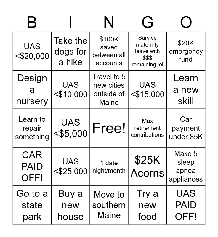This bingo card has a free space and 24 words: UAS <$25,000, Buy a new house, Travel to 5 new cities outside of Maine, Go to a state park, $20K emergency fund, UAS <$20,000, Design a nursery, Take the dogs for a hike, Max retirement contributions, 1 date night/month, UAS <$15,000, Learn to repair something, $25K Acorns, Make 5 sleep apnea appliances, UAS <$10,000, Try a new food, Car payment under $5K, $100K saved between all accounts, Learn a new skill, UAS <$5,000, UAS PAID OFF!, CAR PAID OFF!, Survive maternity leave with $$$ remaining lol and Move to southern Maine.