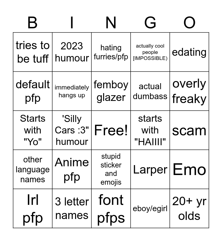 This bingo card has a free space and 24 words: Irl pfp, Anime pfp, femboy glazer, eboy/egirl, edating, tries to be tuff, 2023 humour, hating furries/pfp, starts with "HAIIII", scam, Starts with "Yo", immediately hangs up, Larper, Emo, default pfp, 3 letter names, font pfps, actually cool people [IMPOSSIBLE), overly freaky, other language names, 'Silly Cars :3" humour, stupid sticker and emojis, actual dumbass and 20+ yr olds.