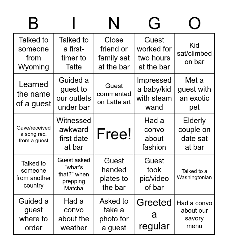 This bingo card has a free space and 24 words: Guest asked "what's that?" when prepping Matcha, Had a convo about the weather, Guest commented on Latte art, Guided a guest where to order, Kid sat/climbed on bar, Talked to someone from Wyoming, Learned the name of a guest, Talked to a first-timer to Tatte, Had a convo about fashion, Guest handed plates to the bar, Impressed a baby/kid with steam wand, Gave/received a song rec. from a guest, Guest took pic/video of bar, Talked to a Washingtonian, Guided a guest to our outlets under bar, Greeted a regular, Elderly couple on date sat at bar, Close friend or family sat at the bar, Met a guest with an exotic pet, Witnessed awkward first date at bar, Had a convo about our savory menu, Talked to someone from another country, Guest worked for two hours at the bar and Asked to take a photo for a guest.