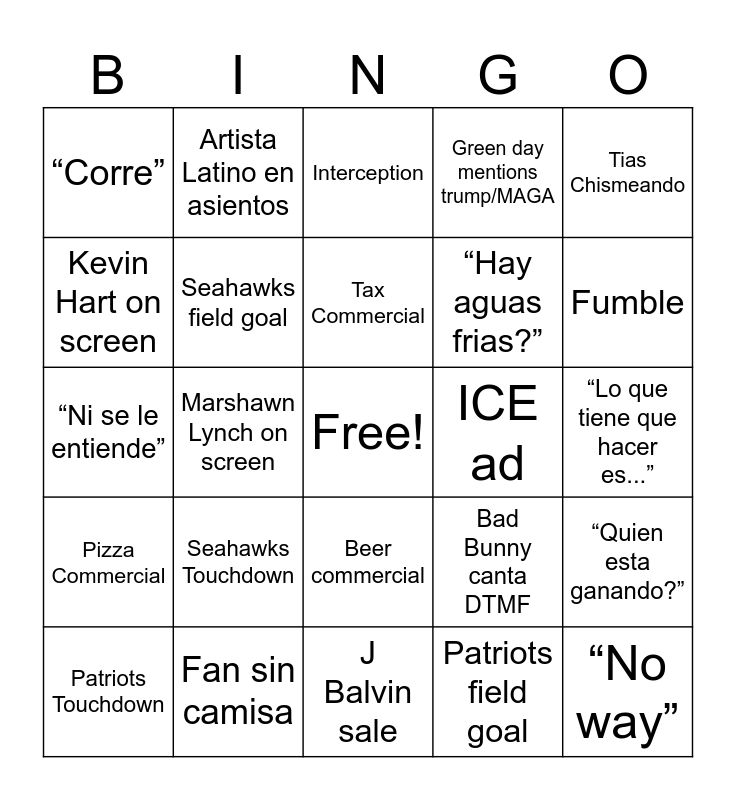 This bingo card has a free space and 25 words: Seahawks Touchdown, J Balvin sale, Tax Commercial, Patriots Touchdown, Tias Chismeando, “Corre”, Kevin Hart on screen, Artista Latino en asientos, ICE ad, Beer commercial, “Hay aguas frias?”, “Ni se le entiende”, Bad Bunny canta DTMF, “Quien esta ganando?”, Seahawks field goal, Crying player, “Lo que tiene que hacer es...”, Interception, Fumble, Marshawn Lynch on screen, “No way”, Fan sin camisa, Pizza Commercial, Green day mentions trump/MAGA and Patriots field goal.