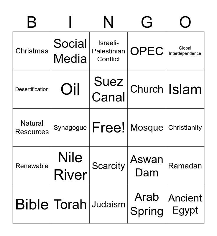 This bingo card has a free space and 24 words: Nile River, Torah, Suez Canal, Bible, Global Interdependence, Christmas, Desertification, Social Media, Mosque, Scarcity, Church, Natural Resources, Aswan Dam, Ramadan, Oil, Arab Spring, Christianity, Israeli-Palestinian Conflict, Islam, Synagogue, Ancient Egypt, Renewable, OPEC and Judaism.