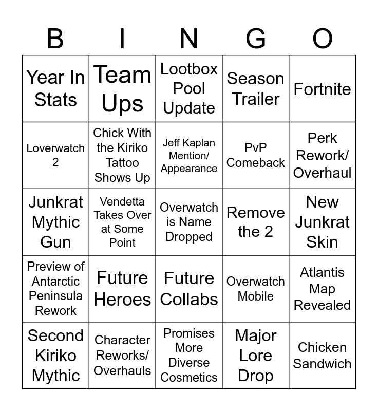 This bingo card has a free space and 24 words: Second Kiriko Mythic, Future Heroes, Jeff Kaplan Mention/ Appearance, Major Lore Drop, Fortnite, Year In Stats, Team Ups, Lootbox Pool Update, Remove the 2, New Junkrat Skin, Junkrat Mythic Gun, Chick With the Kiriko Tattoo Shows Up, Overwatch Mobile, Atlantis Map Revealed, Loverwatch 2, Character Reworks/ Overhauls, Promises More Diverse Cosmetics, Season Trailer, Perk Rework/ Overhaul, Preview of Antarctic Peninsula Rework, Vendetta Takes Over at Some Point, Future Collabs, PvP Comeback and Chicken Sandwich.