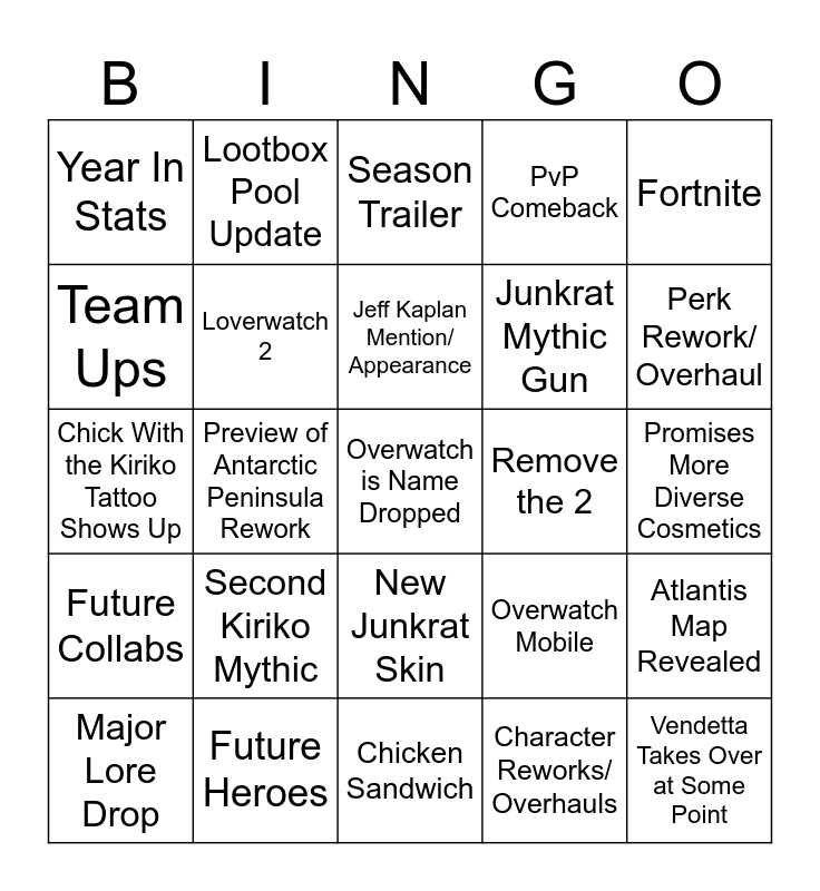 This bingo card has a free space and 24 words: Second Kiriko Mythic, Future Heroes, Jeff Kaplan Mention/ Appearance, Major Lore Drop, Fortnite, Year In Stats, Team Ups, Lootbox Pool Update, Remove the 2, New Junkrat Skin, Junkrat Mythic Gun, Chick With the Kiriko Tattoo Shows Up, Overwatch Mobile, Atlantis Map Revealed, Loverwatch 2, Character Reworks/ Overhauls, Promises More Diverse Cosmetics, Season Trailer, Perk Rework/ Overhaul, Preview of Antarctic Peninsula Rework, Vendetta Takes Over at Some Point, Future Collabs, PvP Comeback and Chicken Sandwich.