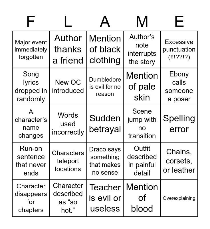 This bingo card has 40 words: Name is misspelled in a new way, A character’s name changes, Canon character acts wildly out of character, New OC introduced, Character described as “so hot.”, Draco says something that makes no sense, Dumbledore is evil for no reason, Random ALL CAPS for emphasis, Excessive punctuation (!!!??!?), Run-on sentence that never ends, Words used incorrectly, Author’s note interrupts the story, Sudden betrayal, Spelling error, Scene jump with no transition, Characters teleport locations, Time passes in a confusing way, Major event immediately forgotten, Emotional reaction does not match situation, Mention of black clothing, Chains, corsets, or leather, Mention of blood, Mention of pale skin, Song lyrics dropped in randomly, Music reference, Sentence contradicts itself, Dialogue with no speaker identified, “Suddenly”, Overexplaining, Underexplaining, Character forgives someone immediately, Character disappears for chapters, Ebony is described physically again, Outfit described in painful detail, Ebony calls someone a poser, Teacher is evil or useless, Everyone is in love with Ebony, Author mentions “flaming”, Author thanks a friend and Major injury disappears.