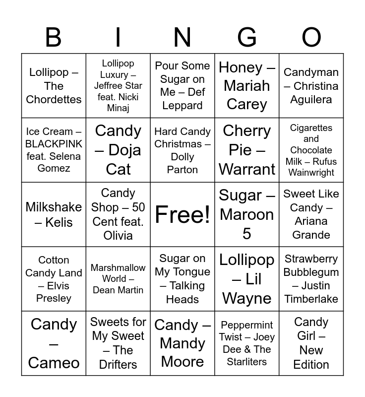 This bingo card has a free space and 31 words: Candy – Mandy Moore, I Want Candy – Bow Wow Wow, Candy Shop – 50 Cent feat. Olivia, Sugar, Sugar – The Archies, Lollipop – The Chordettes, Pour Some Sugar on Me – Def Leppard, Candy – Doja Cat, Lollipop – Lil Wayne, Sugar – Maroon 5, Peppermint Twist – Joey Dee & The Starliters, Sweet Like Candy – Ariana Grande, Candy Girl – New Edition, Sweets – Kelis, Chocolate – The 1975, Cigarettes and Chocolate Milk – Rufus Wainwright, Tootsee Roll – 69 Boyz, Strawberry Bubblegum – Justin Timberlake, Marshmallow World – Dean Martin, Cotton Candy Land – Elvis Presley, Sugar on My Tongue – Talking Heads, Candyman – Christina Aguilera, Butterscotch – Keith Sweat, Candy – Cameo, Lollipop Luxury – Jeffree Star feat. Nicki Minaj, Cherry Pie – Warrant, Ice Cream – BLACKPINK feat. Selena Gomez, Honey – Mariah Carey, Milkshake – Kelis, Sweets for My Sweet – The Drifters, Hard Candy Christmas – Dolly Parton and Funkytown – Lipps Inc..