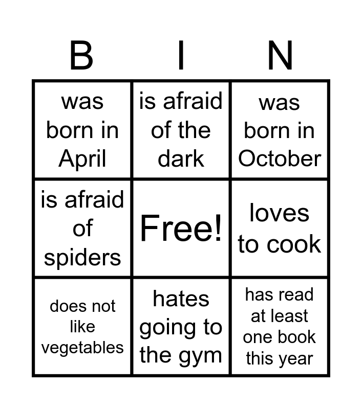 This bingo card has a free space and 29 words: has got a sibling, has visited more than four countries, travelled during holidays, was born in January, was born in April, was born in October, does not like vegetables, ate Mc Donald's last week, drinks coffee, has black as a favourite colour, hates waking up early, is allergic to a specific dish, has got freckles, supports Corinthians, supports Palmeiras, is shorter than you, is older than you, is good at Maths, has read at least one book this year, has watched the same movie as you recently, can whistle, can play an instrument, has met a celebrity in person, loves to cook, is afraid of spiders, is afraid of the dark, likes going to the gym, hates going to the gym and has broken a bone.
