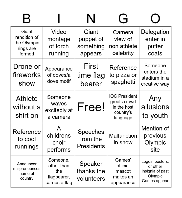 This bingo card has a free space and 30 words: Someone, other than the flagbearer, carries a flag, Athletes wave flags of the host country in addition to their own, Someone waves excitedly at a camera, Delegation with a single athlete appears, Giant rendition of the Olympic rings are formed, Giant puppet of something appears, Appearance of doves/a dove motif, Speeches from the Presidents, IOC President greets crowd in the host country's language, Speaker thanks the volunteers, Any allusions to youth, Logos, posters, or other insignia of past Olympic Games appear, Games' official mascot makes an appearance, Mascot from previous Games makes an appearance, Someone enters the stadium in a creative way, Countdown to ceremony, Malfunction in show, Reference to cool runnings, A childrens choir performs, Delegation enter in puffer coats, Athlete without a shirt on, Opera performance, Video montage of torch running, Reference to pizza or spaghetti, Drone or fireworks show, Camera view of non athlete celebrity, Mention of previous Olympic site, Announcer mispronounces name of country, First time flag bearer and Athlete wearing shorts.