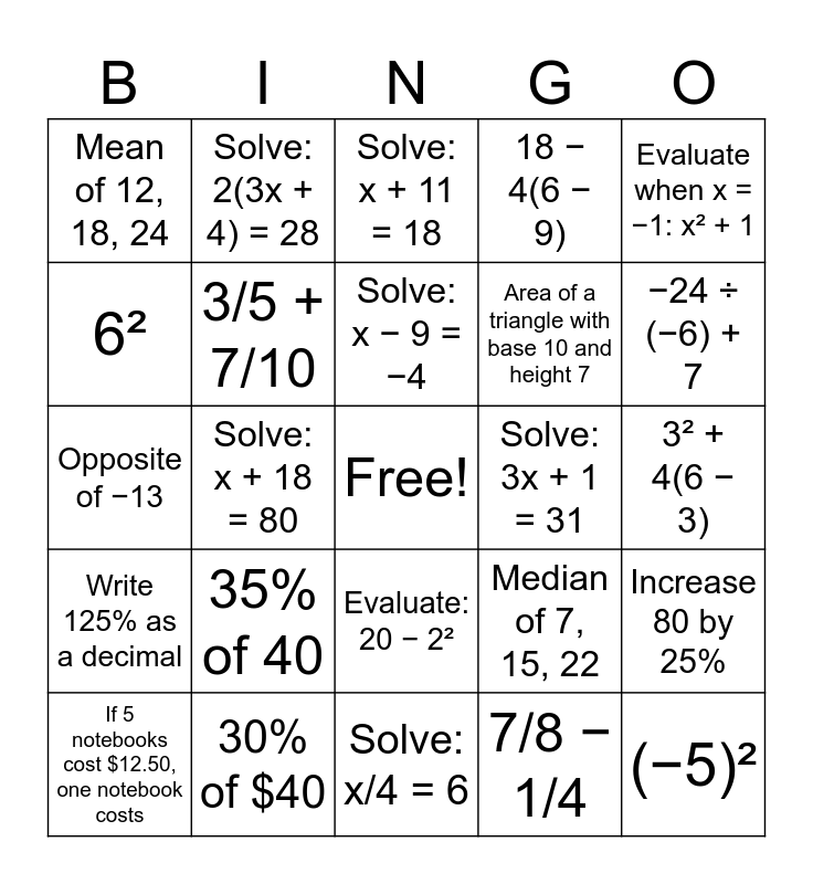This bingo card has a free space and 34 words: Convert 0.6 to a fraction, 7/8 − 1/4, Ratio of 8 to 12 (simplified), Which is greater: 5/6 or 4/5?, Write 125% as a decimal, 3/5 + 7/10, Evaluate when x = −1: x² + 1, If 5 notebooks cost $12.50, one notebook costs, Solve: 2(3x + 4) = 28, Mode of 2, 4, 4, 9, Solve: x − 9 = −4, Solve: x + 11 = 18, Solve: 4x = 32, −3(4 − 7), Solve: 3x + 1 = 31, −24 ÷ (−6) + 7, 30% of $40, Opposite of −13, 35% of 40, Median of 7, 15, 22, Evaluate: 20 − 2², Absolute value of −17, Mean of 12, 18, 24, 3² + 4(6 − 3), Solve: x/4 = 6, (−5)², 18 − 4(6 − 9), Circumference of a circle with diameter 10 (π ≈ 3.14), Area of a triangle with base 10 and height 7, 6², Area of a parallelogram with base 8 and height 6, Solve: x + 18 = 80, Increase 80 by 25% and Number of degrees in a straight angle.