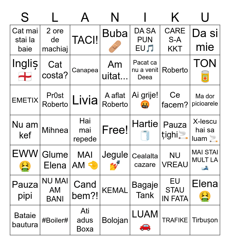 This bingo card has a free space and 48 words: Bagaje Tank, Roberto, Bolojan, Mihnea, Livia, X-lescu hai sa luam 🚬, 2 ore de machiaj, #Boiler#, CARE S-A KKT, Jegule 💅, Da si mie, Buba🩹, Ce facem?, Ai grije!🤬, Pauza pipi, Pauza țighi🚬, Ingliș🏴, TON🥫, EU STAU IN FATA, DA SA PUN EU🎵, Pacat ca nu a venit Deea, Hai mai repede, Cat mai stai la baie, Cat costa?, Elena 🤮, Canapea, Ma dor picioarele, Bataie bautura, A aflat Roberto, Pr0st Roberto, TRAFIKE, Hartie 🧻, MAI STAI MULT LA 🎿, NU MAI AM BANI, Nu am kef, Cealalta cazare, NU VREAU, EMETIX, MAI AM 🤏, Cand bem?!, EWW🤮, Tirbușon, TACI!, Ati adus Boxa, Am uitat..., KEMAL, Glume Elena and LUAM🚗.