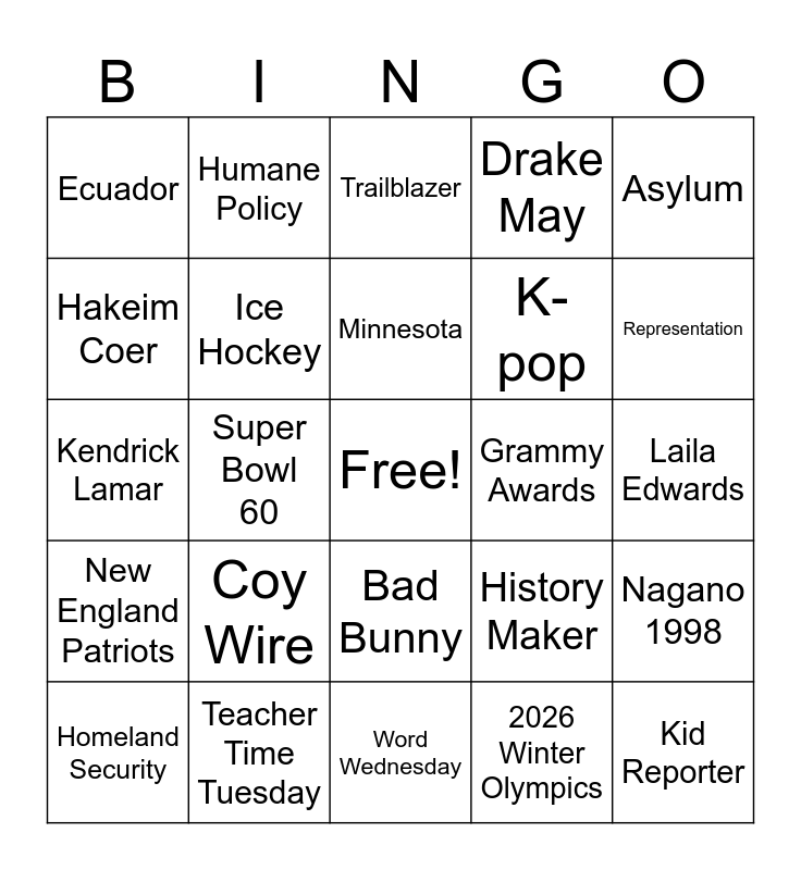 This bingo card has a free space and 24 words: Coy Wire, Teacher Time Tuesday, Minnesota, Homeland Security, Asylum, Ecuador, Hakeim Coer, Humane Policy, Grammy Awards, Bad Bunny, K-pop, Kendrick Lamar, History Maker, Nagano 1998, Ice Hockey, 2026 Winter Olympics, Laila Edwards, Trailblazer, Representation, Super Bowl 60, Kid Reporter, New England Patriots, Drake May and Word Wednesday.