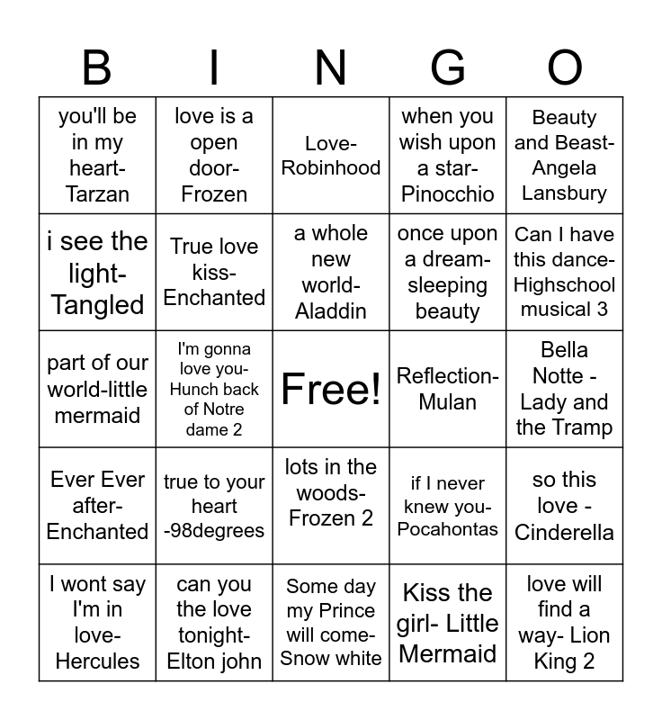 This bingo card has a free space and 24 words: true to your heart -98degrees, can you the love tonight-Elton john, a whole new world-Aladdin, I wont say I'm in love-Hercules, Beauty and Beast- Angela Lansbury, you'll be in my heart- Tarzan, i see the light-Tangled, love is a open door-Frozen, Reflection- Mulan, lots in the woods- Frozen 2, once upon a dream- sleeping beauty, part of our world-little mermaid, if I never knew you-Pocahontas, so this love -Cinderella, True love kiss- Enchanted, Kiss the girl- Little Mermaid, Bella Notte -Lady and the Tramp, Love-Robinhood, Can I have this dance-Highschool musical 3, I'm gonna love you-Hunch back of Notre dame 2, love will find a way- Lion King 2, Ever Ever after-Enchanted, when you wish upon a star- Pinocchio and Some day my Prince will come-Snow white.