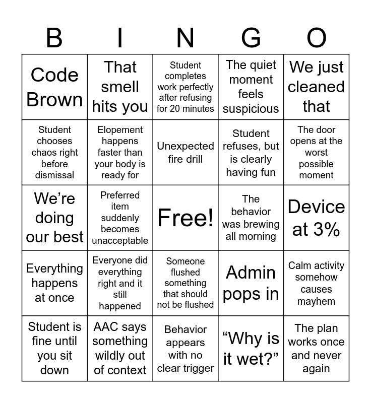 This bingo card has a free space and 26 words: Someone flushed something that should not be flushed, “Why is it wet?”, Unexpected fire drill, AAC says something wildly out of context, We just cleaned that, Code Brown, Student chooses chaos right before dismissal, That smell hits you, Device at 3%, Admin pops in, Student refuses, but is clearly having fun, We’re doing our best, Calm activity somehow causes mayhem, Student is fine until you sit down, Preferred item suddenly becomes unacceptable, “I’ll grab that in a second” (never happens), The quiet moment feels suspicious, Everything happens at once, Student completes work perfectly after refusing for 20 minutes, The plan works once and never again, The door opens at the worst possible moment, Behavior appears with no clear trigger, The behavior was brewing all morning, Everyone did everything right and it still happened, Elopement happens faster than your body is ready for and You maintain a neutral face through something unhinged.