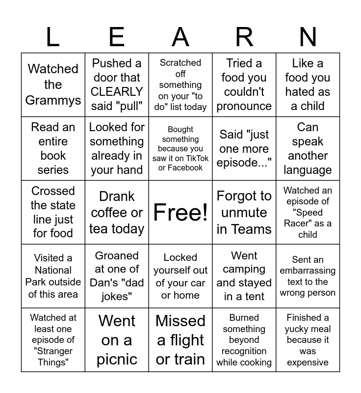 This bingo card has a free space and 29 words: Watched at least one episode of "Stranger Things", Visited somewhere outside of the country, Drank coffee or tea today, Learned something new today, Watched the Grammys, Scratched off something on your "to do" list today, Looked for something already in your hand, Groaned at one of Dan's "dad jokes", Forgot to unmute in Teams, Went on a picnic, Watched an episode of "Speed Racer" as a child, Finished a yucky meal because it was expensive, Missed a flight or train, Burned something beyond recognition while cooking, Can speak another language, Binge-watched an entire season in one weekend, Locked yourself out of your car or home, Visited a National Park outside of this area, Like a food you hated as a child, Crossed the state line just for food, Went camping and stayed in a tent, Ordered something and immediately regretted it, Said "just one more episode...", Read an entire book series, Tried a food you couldn't pronounce, Pushed a door that CLEARLY said "pull", Sent an embarrassing text to the wrong person, Bought something because you saw it on TikTok or Facebook and Said something that only your parents would say.