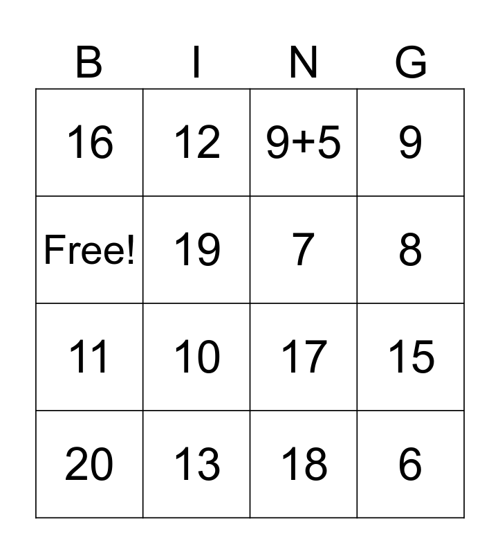 This bingo card has 16 words: 13, 15, 9+5, 16, 11, 12, 17, 18, Free!, 19, 20, 9, 10, 8, 7 and 6.