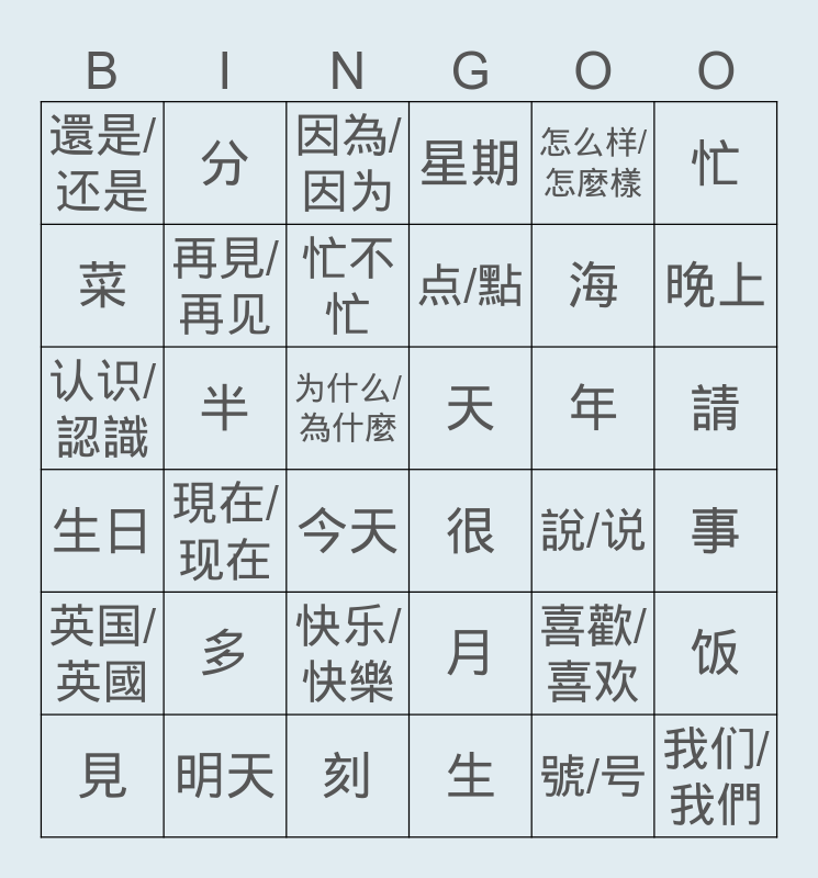 This bingo card has 36 words: 月, 快乐/ 快樂, 生, 菜, 生日, 天, 再見/再见, 刻, 怎么样/怎麼樣, 喜歡/喜欢, 晚上, 星期, 饭, 半, 点/點, 還是/还是, 英国/英國, 年, 认识/認識, 因為/因为, 为什么/為什麼, 現在/ 现在, 很, 今天, 說/说, 分, 海, 明天, 忙不忙, 忙, 我们/我們, 見, 事, 請, 多 and 號/号.