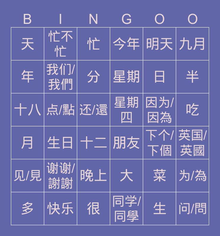 This bingo card has 36 words: 大, 晚上, 同学/同學, 年, 月, 星期四, 我们/我們, 很, 明天, 菜, 半, 今年, 为/為, 点/點, 星期, 天, 见/見, 因为/因為, 十八, 忙, 还/還, 生日, 朋友, 十二, 下个/下個, 忙不忙, 日, 快乐, 分, 九月, 问/問, 多, 英国/英國, 吃, 谢谢/謝謝 and 生.
