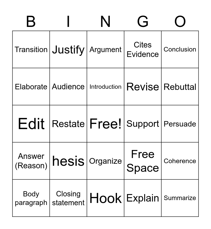 This bingo card has a free space and 25 words: hesis, Hook, Introduction, Body paragraph, Conclusion, Transition, Elaborate, Justify, Support, Organize, Revise, Edit, Free Space, Coherence, Audience, Formal tone, Persuade, Argument, Rebuttal, Restate, Summarize, Closing statement, Answer (Reason), Cites Evidence and Explain.