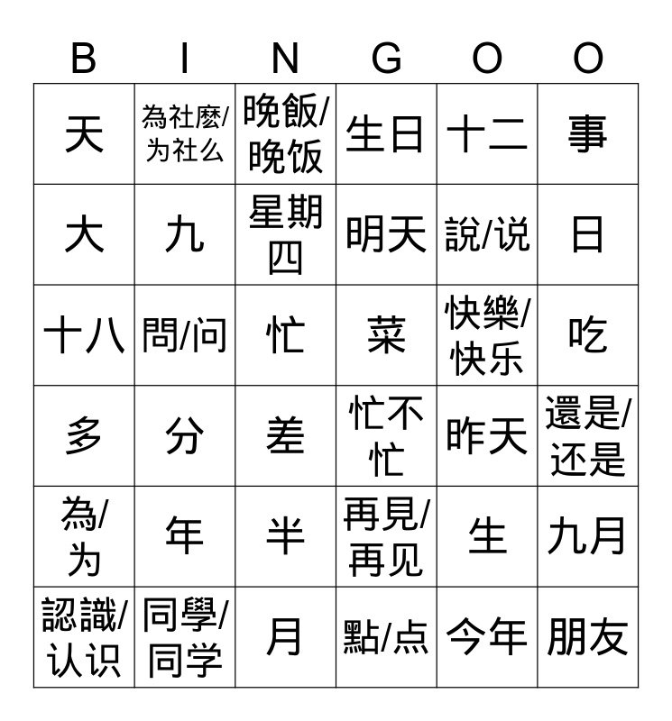 This bingo card has 36 words: 再見/ 再见, 半, 點/点, 大, 多, 菜, 九, 月, 十二, 生, 日, 生日, 九月, 問/问, 明天, 天, 為/ 为, 快樂/快乐, 十八, 晚飯/晚饭, 忙, 分, 忙不忙, 差, 昨天, 為社麽/ 为社么, 說/说, 同學/同学, 星期四, 事, 朋友, 認識/认识, 還是/还是, 吃, 年 and 今年.
