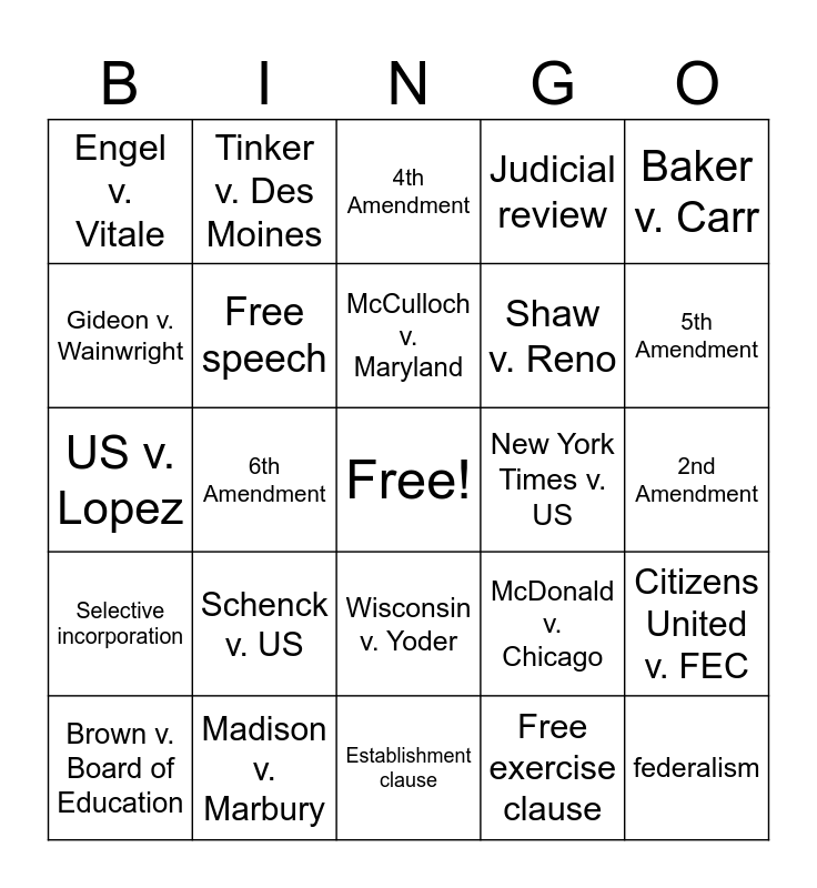This bingo card has a free space and 24 words: Schenck v. US, Madison v. Marbury, McCulloch v. Maryland, Brown v. Board of Education, Baker v. Carr, Engel v. Vitale, Gideon v. Wainwright, Tinker v. Des Moines, New York Times v. US, Wisconsin v. Yoder, Shaw v. Reno, US v. Lopez, McDonald v. Chicago, Citizens United v. FEC, Free speech, Free exercise clause, 2nd Amendment, 4th Amendment, 5th Amendment, 6th Amendment, federalism, Selective incorporation, Judicial review and Establishment clause.