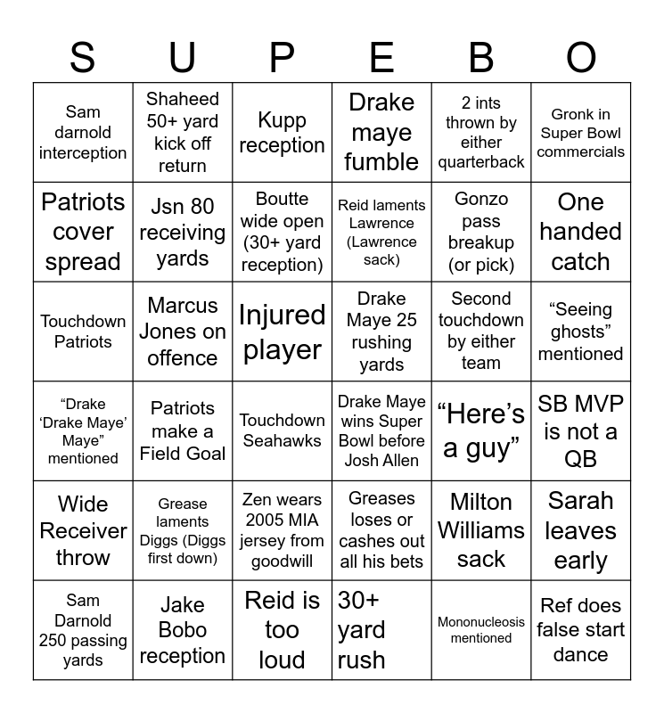 This bingo card has 41 words: 30+ yard rush, Gonzo pass breakup (or pick), Stinky dance, Patriots cover spread, Drake Maye wins Super Bowl before Josh Allen, “Seeing ghosts” mentioned, Jsn 80 receiving yards, Bad Bunny wears a dress, 2 ints thrown by either quarterback, Drake Maye 25 rushing yards, One handed catch, Drake maye fumble, Touchdown Patriots, Injured player, Marcus Jones on offence, Second touchdown by either team, Sam Darnold 250 passing yards, Sam darnold interception, Mononucleosis mentioned, Kupp reception, Patriots make a Field Goal, Wide Receiver throw, “Here’s a guy”, Boutte wide open (30+ yard reception), Ref does false start dance, Milton Williams sack, SB MVP is not a QB, Grease laments Mack (Mack 15+ yard reception), Reid laments Lawrence (Lawrence sack), Grease laments Diggs (Diggs first down), Tonga on offence, Shaheed 50+ yard kick off return, Touchdown Seahawks, Jake Bobo reception, “Drake ‘Drake Maye’ Maye” mentioned, Gronk in Super Bowl commercials, Zen wears 2005 MIA jersey from goodwill, Sarah leaves early, Reid is too loud, Greases loses or cashes out all his bets and Grease spills.