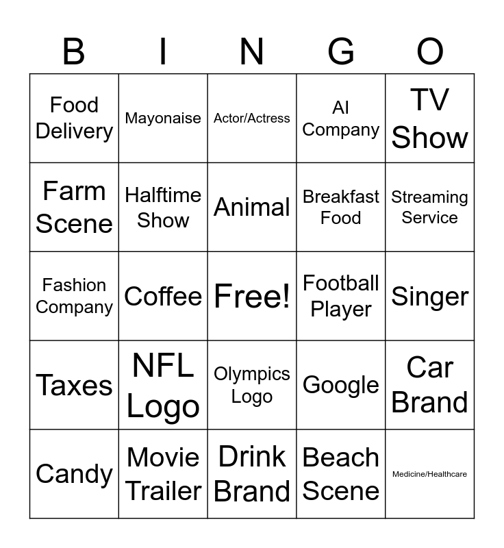 This bingo card has a free space and 24 words: NFL Logo, Movie Trailer, Animal, Candy, TV Show, Food Delivery, Farm Scene, Mayonaise, Football Player, Olympics Logo, Breakfast Food, Fashion Company, Google, Car Brand, Halftime Show, Beach Scene, Singer, Actor/Actress, Streaming Service, Coffee, Medicine/Healthcare, Taxes, AI Company and Drink Brand.