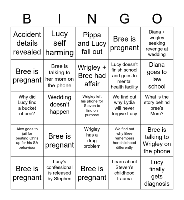 This bingo card has 30 words: Bree is pregnant, Alex gives Chris R drugs, Wrigley + Bree had affair, Diana kept baby, Diana + wrigley seeking revenge at wedding, Accident details revealed, Lucy self harming, Wrigley has a drug problem, We find out why Lydia will never forgive Lucy, Lucy finally gets diagnosis, Alex goes to jail for beating Chris up for his SA behaviour, Bree is talking to her mom on the phone, Free!, Learn about Steven’s childhood trauma, Bree is talking to Wrigley on the phone, Stephen uses Diana‘s nude photos against her, Wedding doesn’t happen, Wrigley left his phone for Steven to find on purpose, We find out why Bree remembers her childhood differently, Diana goes to law school, Why did Lucy find a bucket of pee?, Lucy’s confessional is released by Stephen, Pippa and Lucy fall out, Lucy doesn’t finish school and goes to mental health facility, What is the story behind bree’s Mom?, Bree is pregnant, Bree is pregnant, Bree is pregnant, Bree is pregnant and Bree is pregnant.