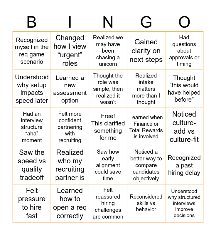 This bingo card has a free space and 24 words: Realized who my recruiting partner is, Learned how to open a req correctly, Thought the role was simple, then realized it wasn’t, Felt pressure to hire fast, Had questions about approvals or timing, Recognized myself in the req game scenario, Understood why setup impacts speed later, Changed how I view “urgent” roles, Learned when Finance or Total Rewards is involved, Saw how early alignment could save time, Realized intake matters more than I thought, Had an interview structure “aha” moment, Noticed a better way to compare candidates objectively, Recognized a past hiring delay, Learned a new assessment option, Reconsidered skills vs behavior, Noticed culture-add vs culture-fit, Realized we may have been chasing a unicorn, Thought “this would have helped before”, Felt more confident partnering with recruiting, Understood why structured interviews improve decisions, Saw the speed vs quality tradeoff, Gained clarity on next steps and Felt reassured hiring challenges are common.