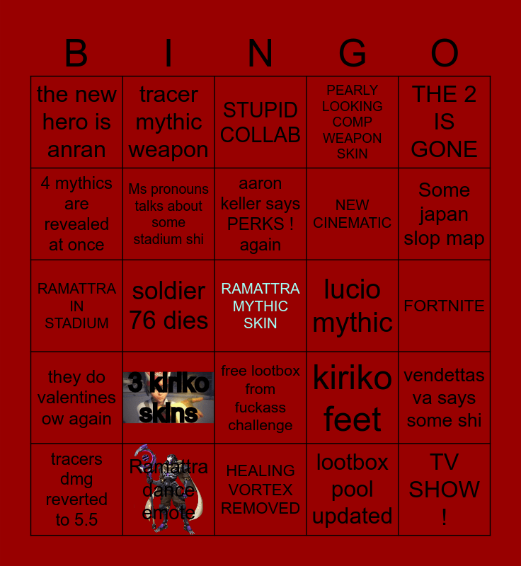 This bingo card has 2 images, a free space and 24 words: 3 kiriko skins, Ramattra dance emote, aaron keller says PERKS ! again, tracers dmg reverted to 5.5, THE 2 IS GONE, the new hero is anran, 4 mythics are revealed at once, tracer mythic weapon, lucio mythic, free lootbox from fuckass challenge, NEW CINEMATIC, RAMATTRA IN STADIUM, kiriko feet, vendettas va says some shi, Ms pronouns talks about some stadium shi, lootbox pool updated, FORTNITE, STUPID COLLAB, Some japan slop map, soldier 76 dies, TV SHOW !, they do valentines ow again, PEARLY LOOKING COMP WEAPON SKIN and HEALING VORTEX REMOVED.