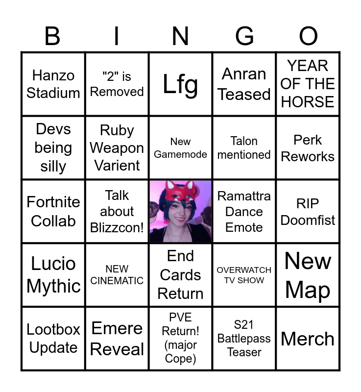 This bingo card has a free space and 24 words: NEW CINEMATIC, Emere Reveal, New Gamemode, Lootbox Update, YEAR OF THE HORSE, Hanzo Stadium, Devs being silly, "2" is Removed, Ramattra Dance Emote, End Cards Return, Talon mentioned, Fortnite Collab, OVERWATCH TV SHOW, New Map, Ruby Weapon Varient, S21 Battlepass Teaser, RIP Doomfist, Lfg, Perk Reworks, Talk about Blizzcon!, Merch, Lucio Mythic, Anran Teased and PVE Return! (major Cope).