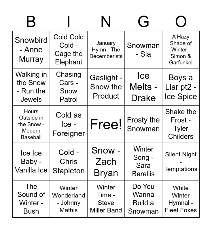 This bingo card has a free space and 35 words: Snow (Hey Oh) - Red Hot Chili Peppers, Informer - Snow, Snow on the Beach - Taylor Swift, Chasing Cars - Snow Patrol, Snow - Zach Bryan, Snowman - Sia, Walking in the Snow - Run the Jewels, Let it Snow - Dean Martin, Gaslight - Snow the Product, Genghis Kahn - Miike Snow, Hours Outside in the Snow - Modern Baseball, A Hazy Shade of Winter - Simon & Garfunkel, Baby, It's Cold Outside - Dean Martin, Sleigh Ride - The Ronettes, Snowbird - Anne Murray, Frosty the Snowman, Do You Wanna Build a Snowman, Cold as Ice - Foreigner, Ice Ice Baby - Vanilla Ice, White Winter Hymnal - Fleet Foxes, Winter Song - Sara Barellis, The Sound of Winter - Bush, Silent Night - Temptations, Winter Wonderland - Johnny Mathis, January Hymn - The Decemberists, Boys a Liar pt2 - Ice Spice, Deli - Ice Spice, It Was a Good Day - Ice Cube, Ice Melts - Drake, Shake the Frost - Tyler Childers, The Blizzard - Johnny Cash, Winter Time - Steve Miller Band, Cold - Chris Stapleton, Cold Cold Cold - Cage the Elephant and Frozen - Madonna.