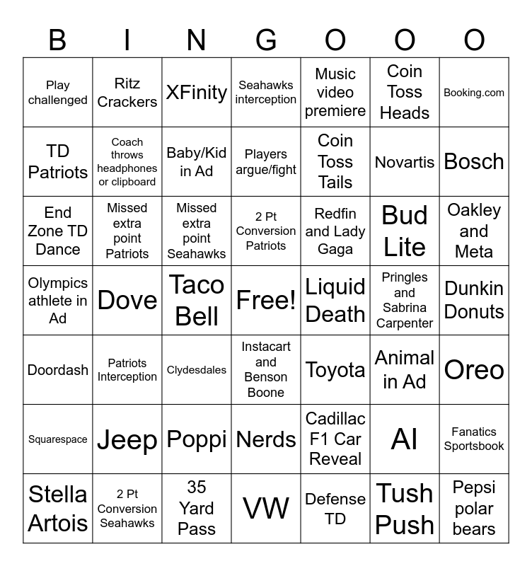 This bingo card has a free space and 63 words: Dorritos, Dunkin Donuts, Budweiser, Bud Lite, Clydesdales, Stella Artois, Ritz Crackers, TD Seahawks, TD Patriots, 2 Pt Conversion Seahawks, 2 Pt Conversion Patriots, Cadillac F1 Car Reveal, End Zone TD Dance, Music video premiere, Movie Trailer, Coin Toss Heads, Coin Toss Tails, Play challenged, Coach Yelling, Coach throws headphones or clipboard, Missed extra point Seahawks, Missed extra point Patriots, Seahawks interception, Patriots Interception, QB Sack, Animal in Ad, Instacart and Benson Boone, Lays, Pringles and Sabrina Carpenter, Squarespace, Reeses, Nerds, Michelob Ultra, Uber Eats, Baby/Kid in Ad, Oakley and Meta, AI, Taco Bell, Oreo, Booking.com, Players argue/fight, Bosch, Fanatics Sportsbook, Hellmans, Novartis, Olympics athlete in Ad, Pepsi polar bears, Redfin and Lady Gaga, 35 Yard Pass, Defense TD, Tush Push, Dove, Doordash, Liquid IV, T Mobile, XFinity, Poppi, Toyota, Jeep, VW, Cosmetic Ad, Liquid Death and Facemask penalty.